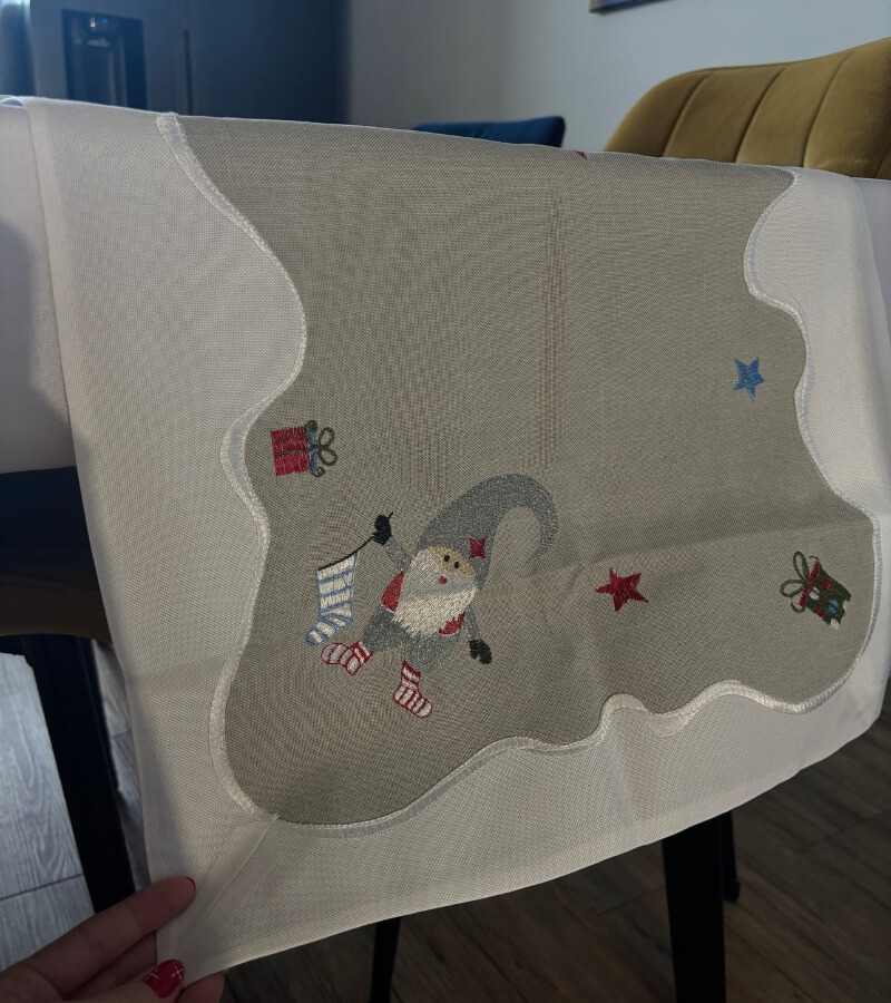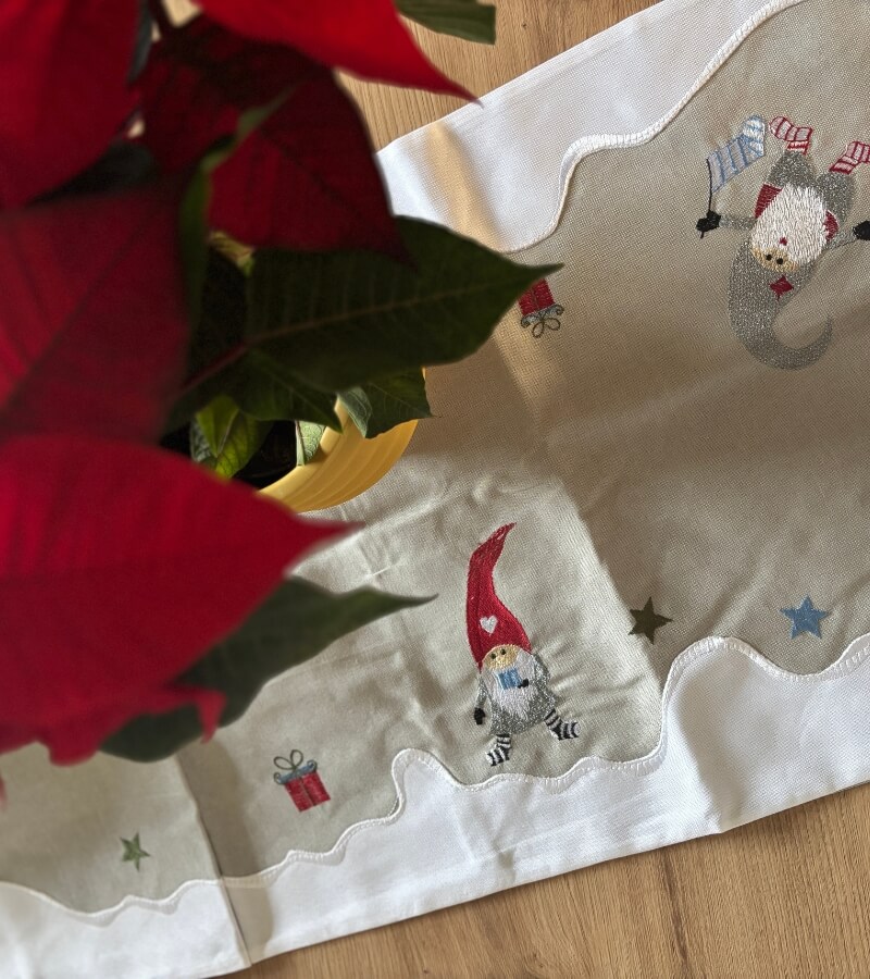 Chcesz szybko dodać wnętrzu odrobiny bożonarodzeniowego uroku? Bieżnik świąteczny 40×160 cm w odcieniach szarości i bieli z haftowanymi skrzatami tworzy ciepły, rodzinny nastrój bez nadmiaru dekoracji. Doskonale wygląda na białym obrusie i drewnianym blacie.