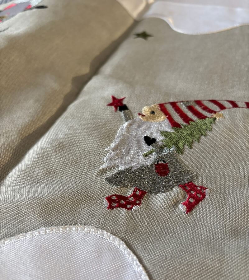 - Wprowadza świąteczny klimat dzięki detalicznemu haftowi skrzatów.