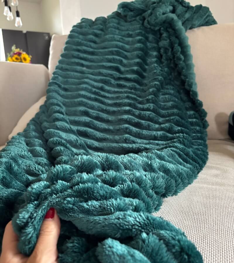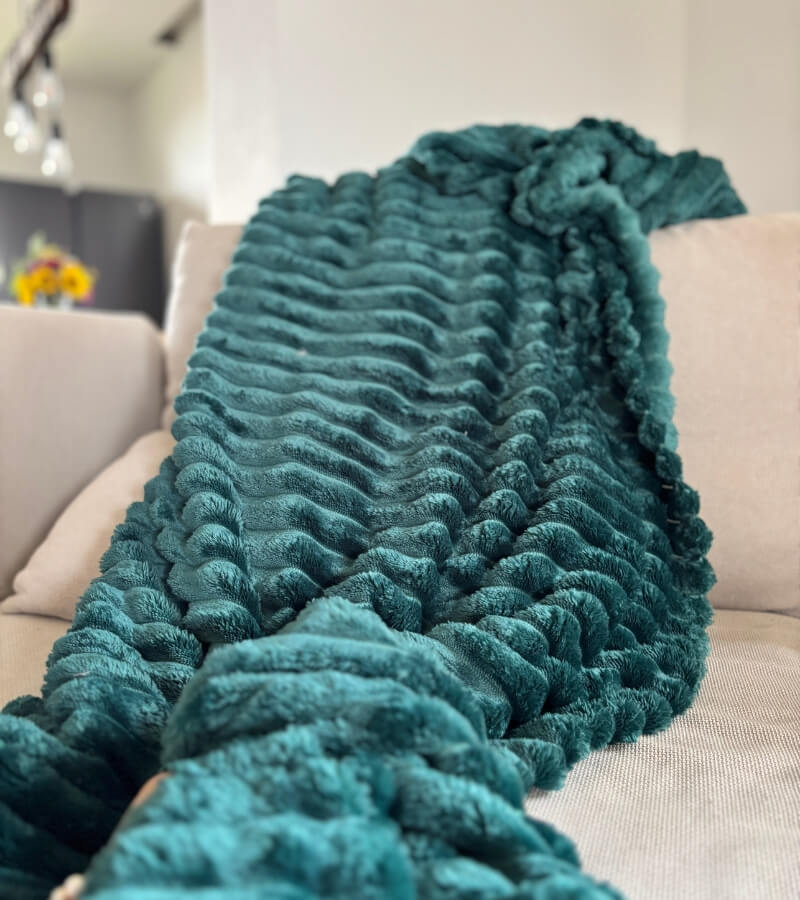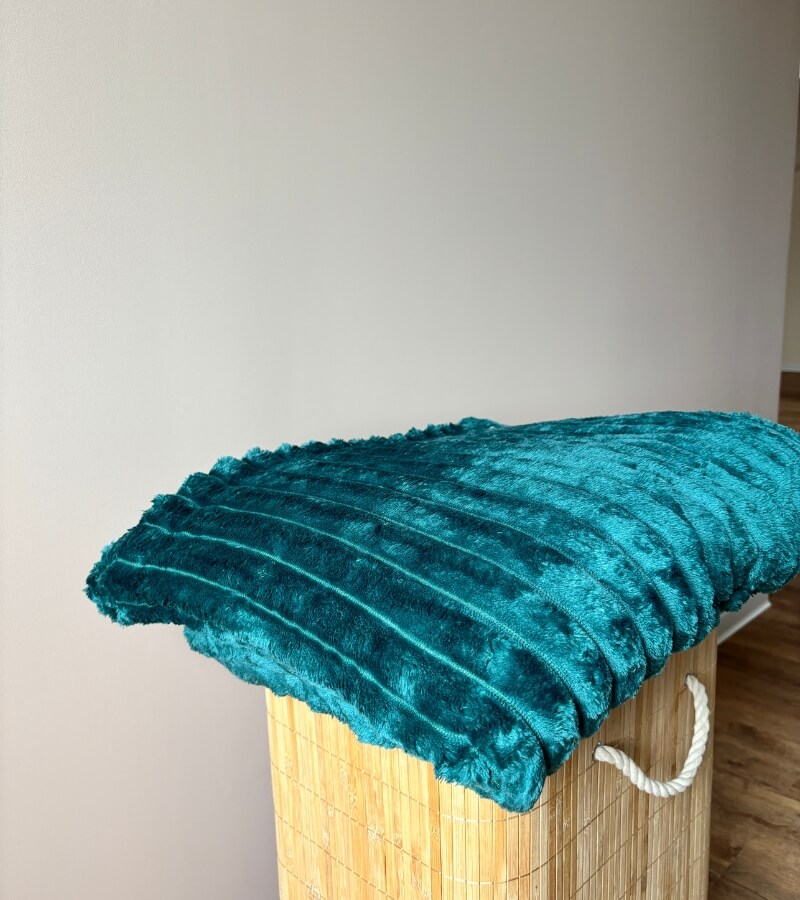 Koc Velvet Prążek w kolorze butelkowej zieleni to propozycja dla miłośników ciepłych, naturalnych wnętrz. Przyciąga wzrok głębią barwy i delikatnym tłoczeniem w szerokie prążki, które dodaje teksturze charakteru. Rozmiar 160×200 cm świetnie sprawdza się jako koc do codziennego otulenia, narzuta na kanapę lub towarzysz popołudniowej drzemki.