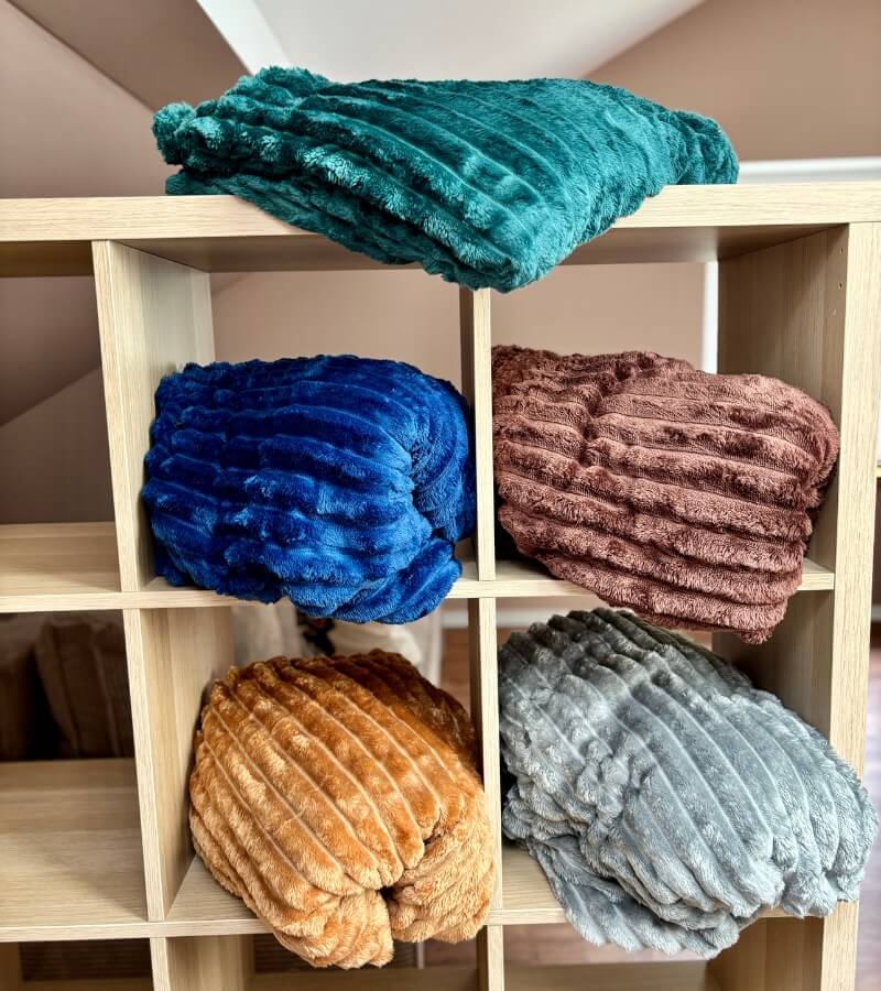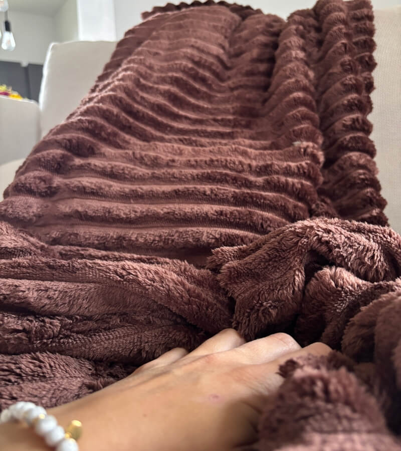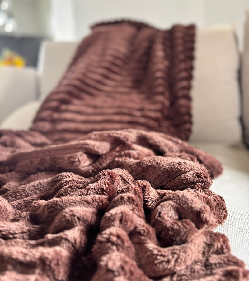 Velvetowa mikrofibra (100% poliester) jest niezwykle miła dla skóry, a tłoczenie w prążek dodaje jej objętości. Koc łatwo utrzymać w czystości: pierz w 30°C, wysusz na powietrzu – będzie wyglądał jak nowy.