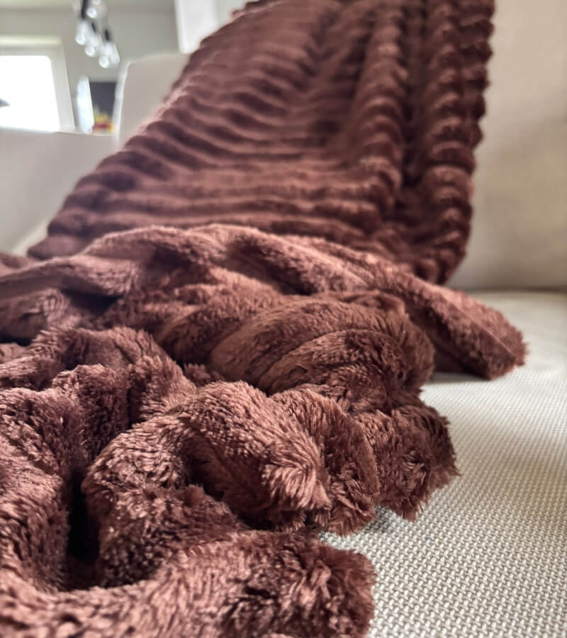 Czekoladowy koc Velvet Prążek to szybki sposób na ocieplenie aranżacji. Jego karmelowo-brązowa tonacja pięknie współgra z beżami, drewnem i zielenią roślin. Rozmiar 160×200 cm jest idealny do salonu – wystarczająco duży, by się otulić, a zarazem poręczny.