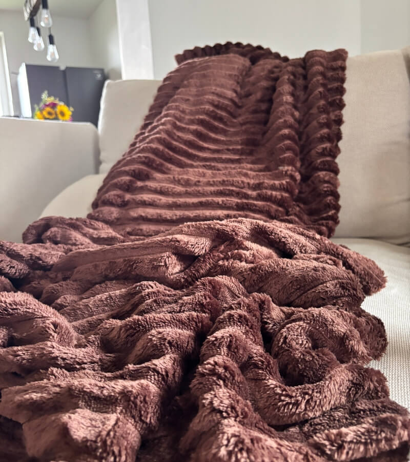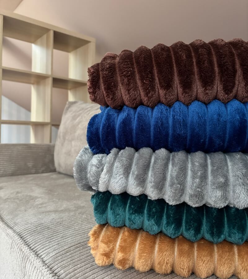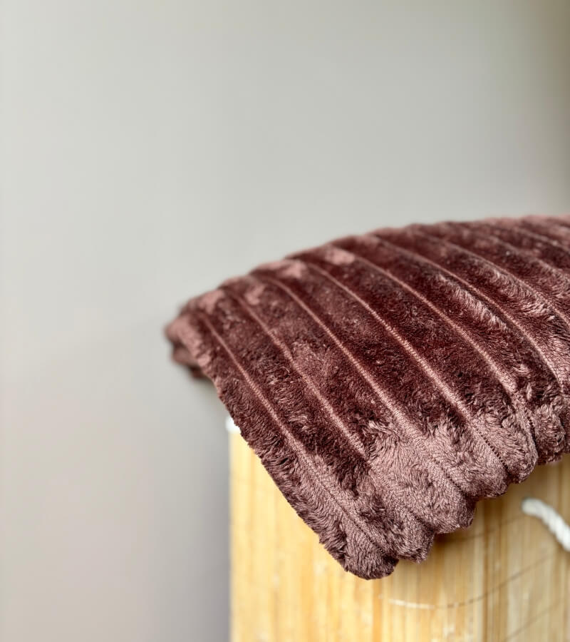 Wersja 220×200 cm w kolorze czekolady to wybór, który doda sypialni przytulności. Subtelny połysk velvetu i struktura prążków tworzą elegancki efekt, a duży format sprawdzi się jako narzuta na łóżko małżeńskie lub jako koc do wspólnego leniuchowania.