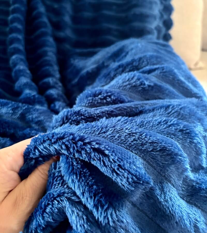 Granatowy koc Velvet Prążek to klasyka w nowoczesnym wydaniu. Tłoczenie w szerokie prążki tworzy subtelny efekt 3D, a głęboka barwa pięknie łączy się z jasnymi i drewnianymi elementami wystroju. Format 160×200 cm sprawdzi się w salonie – do filmu, książki czy popołudniowej drzemki.