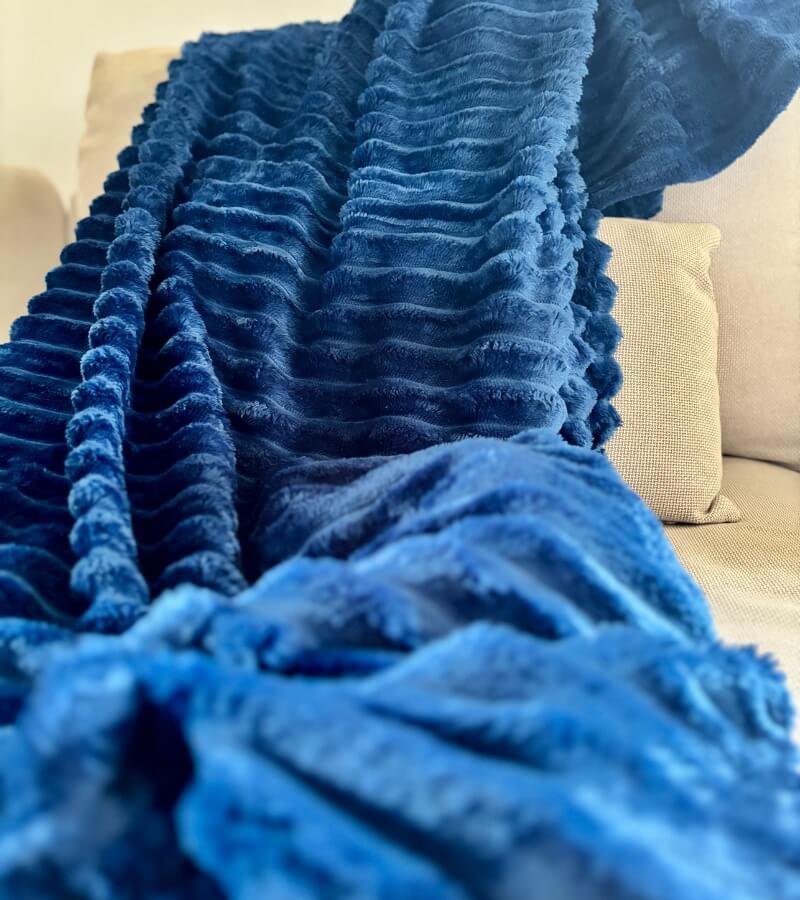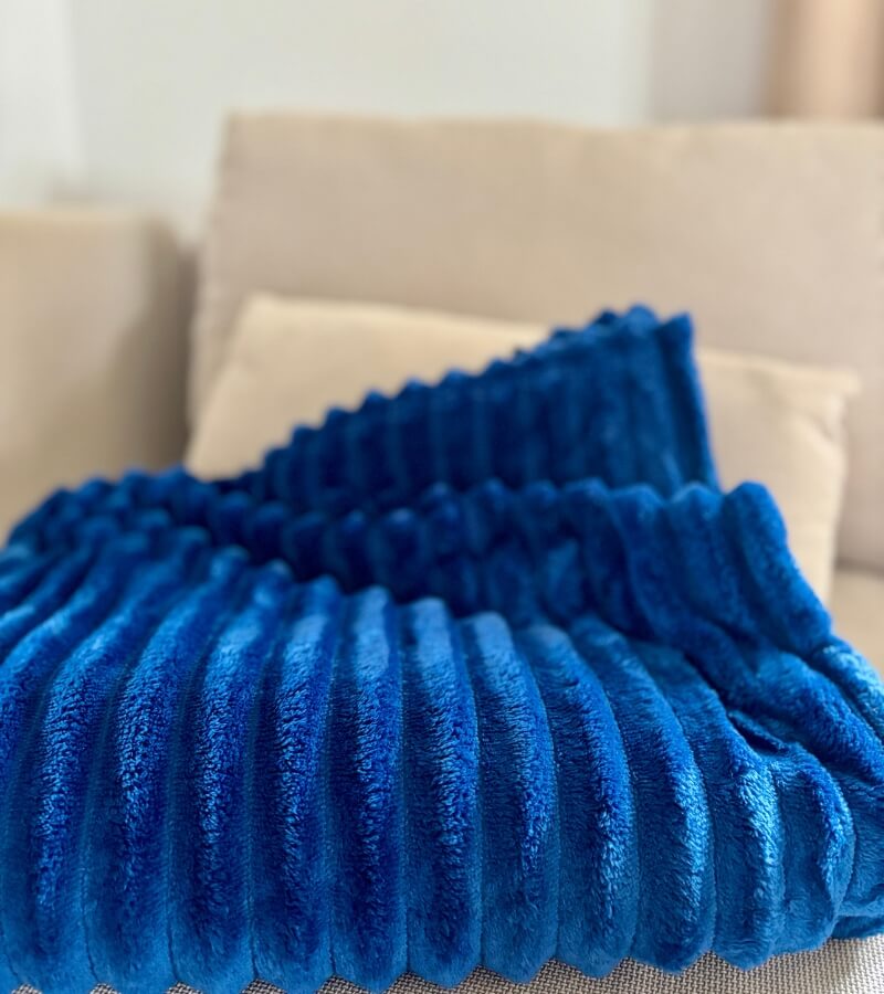 Jeśli szukasz efektownej narzuty, granatowa wersja 220×200 cm zrobi wrażenie. Gładki połysk velvetu i prążkowanie porządkują materac, a ciemny odcień dodaje głębi. Koc jest lekki, ale otulający – idealny na chłodniejsze wieczory i jako dzienny pled.