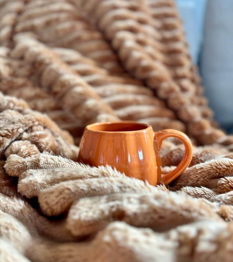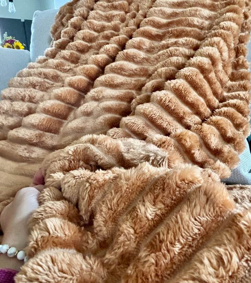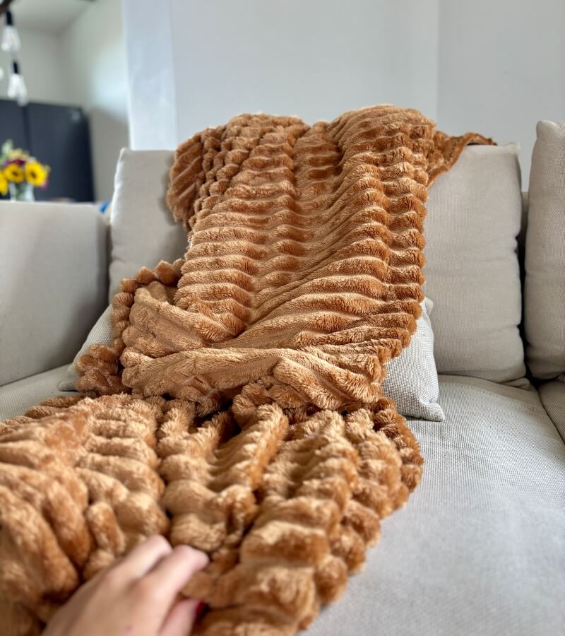 Karmelowa wersja 220×200 cm pięknie podkreśla łóżko małżeńskie i dodaje wnętrzu przyjemnej, “hotelowej” atmosfery. Prążkowanie sprawia, że tkanina układa się równo, a aksamitny połysk dodaje klasy. Koc jest lekki, ale zapewnia przyjemne ciepło.