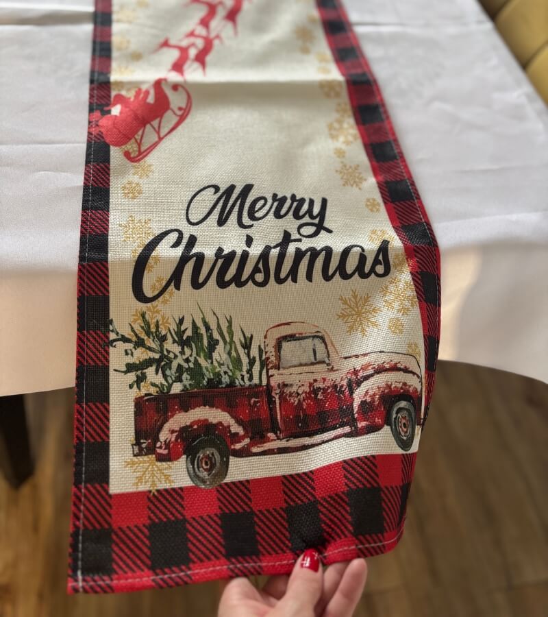 Połączenie lnu z ikoną świąt (auto, choinka, krata) daje ciepły, rodzinny efekt bez kiczu. Szerokość 30 cm nie zabiera miejsca na zastawę, a długość 180 cm pasuje do większości stołów.