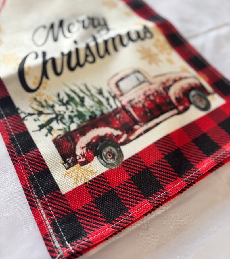 - Podkreśla aranżację stołu klasyczną czerwoną kratą i motywem auta z choinką.