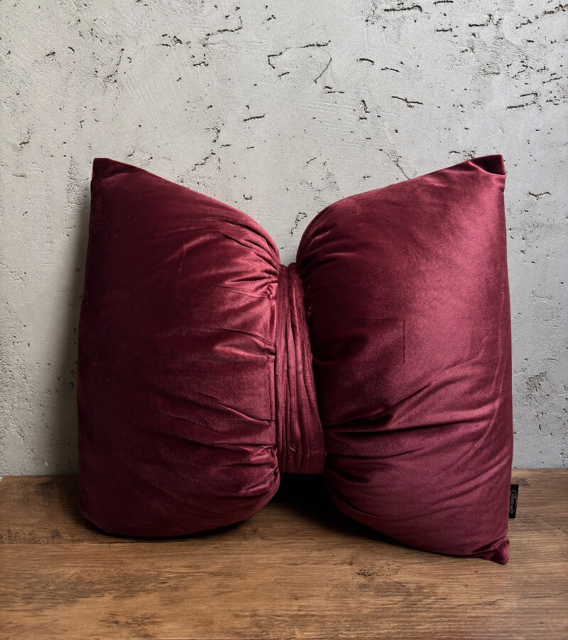 Na tle klasycznych, prostokątnych poduszek ta wyróżnia się formą i kolorem. Kształt kokardy, staranne marszczenia w centralnej części oraz welwetowa tkanina sprawiają, że wygląda jak element świątecznej stylizacji, a jednocześnie pasuje do wielu aranżacji przez cały rok. Bordo pięknie komponuje się z beżami, szarościami, złotem czy bielą – bez problemu dopasujesz ją do zasłon, narzuty czy pościeli.