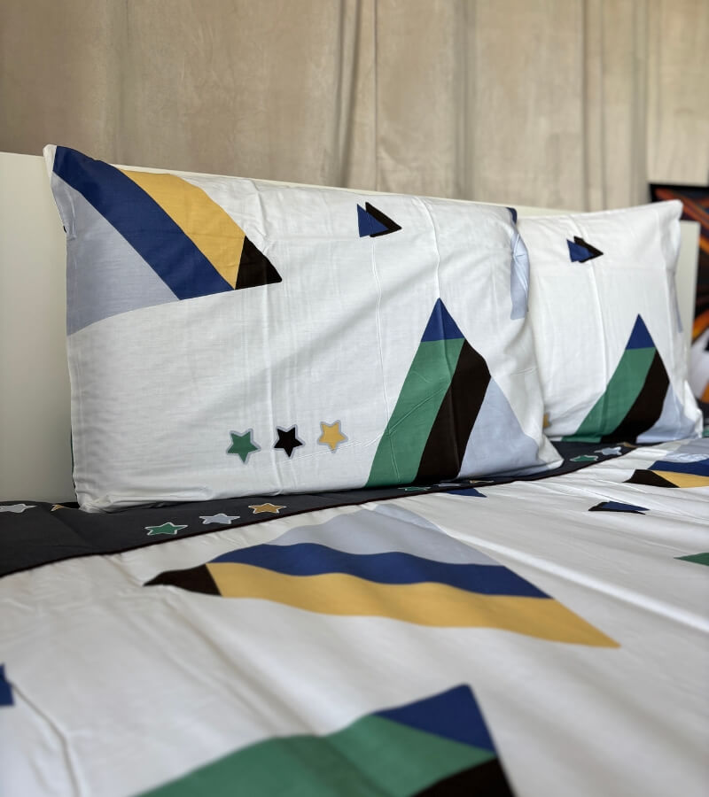 Trzymasz w rękach gotowy zestaw: poszwa 160×200 cm i dwie poszewki 70×80 cm, z wygodnymi suwakami i trwałym nadrukiem. Bawełna zapewnia komfort termiczny o każdej porze roku, a geometryczny motyw z gwiazdkami łatwo dopasujesz do poduszek dekoracyjnych i narzut.
