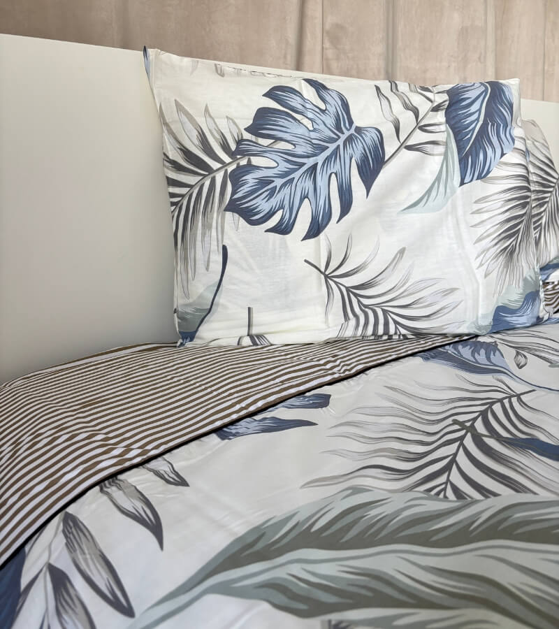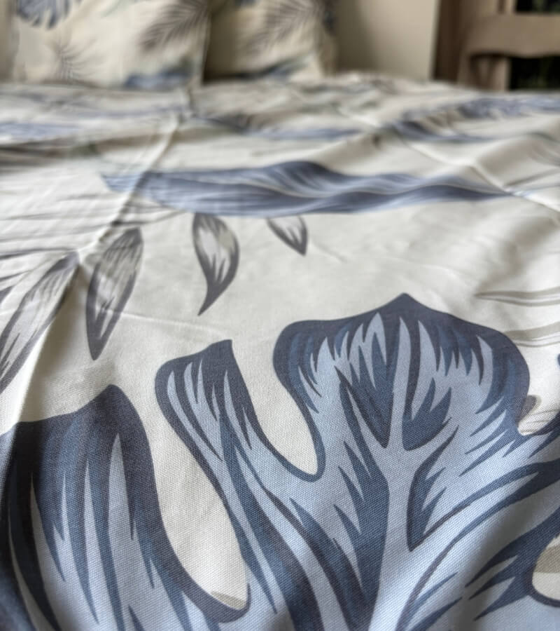 Otul się spokojem – ta pościel 200×220 z naturalnej bawełny wprowadza do sypialni kojący klimat i świeżość. Delikatna kolorystyka liści w niebiesko-szarej tonacji uspokaja, a miękka w dotyku tkanina sprzyja wyciszeniu po całym dniu.