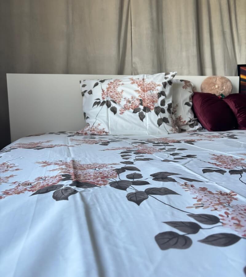 Wskazówka stylizacyjna: dobierz prześcieradło w kolorze ecru lub delikatnego beżu i jedną dekoracyjną poduszkę w odcieniu burgundu lub pudrowego różu – podkreślisz kwiatowy motyw bez wrażenia przesytu.