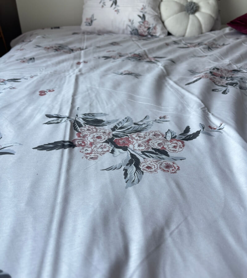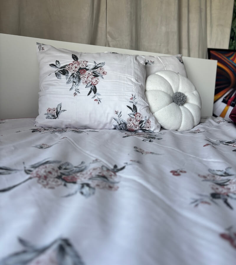 - Odmienia wystrój – pastelowy, kwiatowy nadruk rozjaśnia i uspokaja sypialnię.