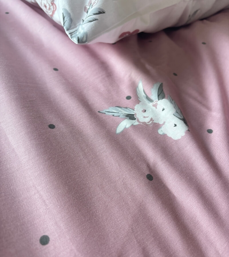 Na tle innych zestawów „Pastelowa Magnolia” wyróżnia się spójnym wzorem poszwy i dwóch poszewek 70×80, solidnie wszytymi suwakami oraz możliwością suszenia w suszarce – pielęgnacja jest szybka i prosta. Prasowanie do 150°C sprawia, że tkanina układa się równo i wygląda elegancko.