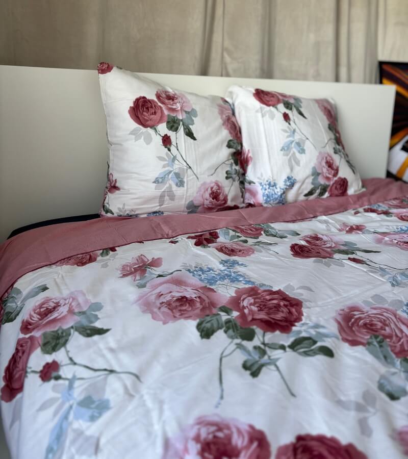 Wskazówka stylizacyjna: połącz pościel z prześcieradłem w kolorze jasnego różu lub ecru i dodaj jedną dekoracyjną poduszkę w głębszym burgundzie – podkreślisz romantyczny charakter bez przesytu.