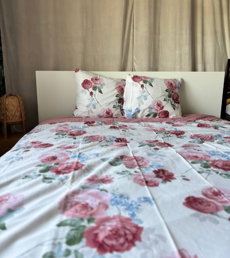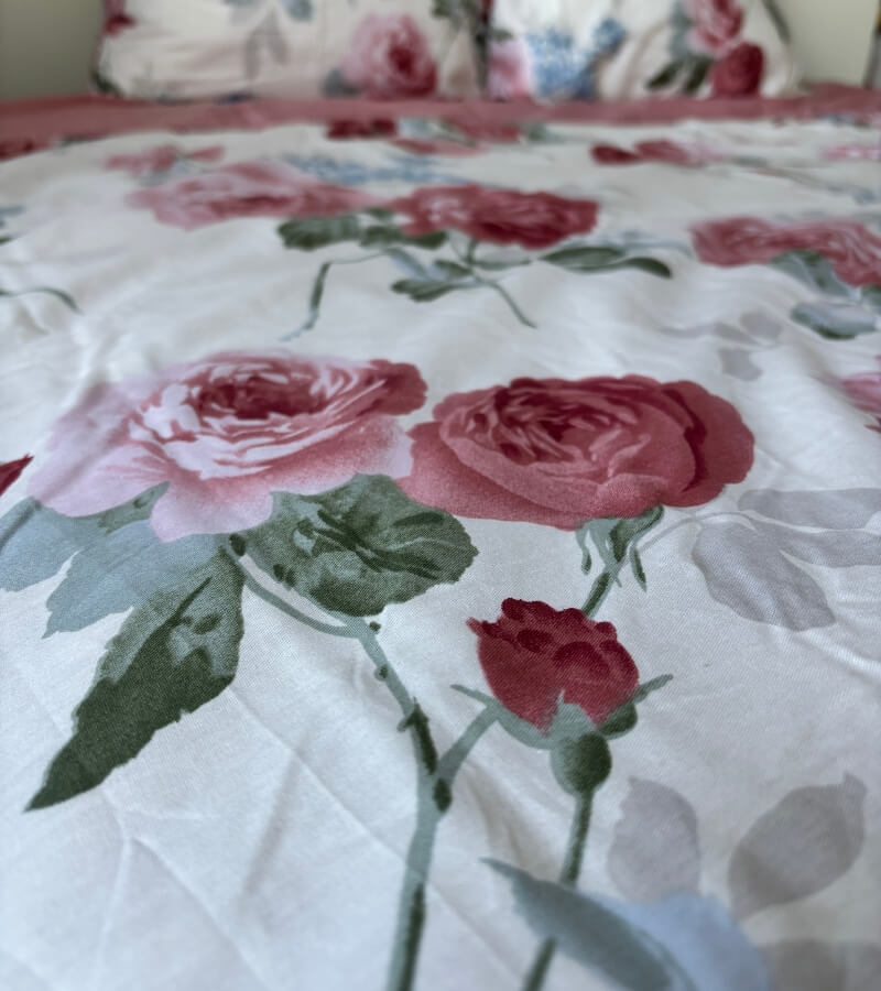- Odmienia wystrój – pastelowy, kwiatowy wzór róż rozjaśnia sypialnię.