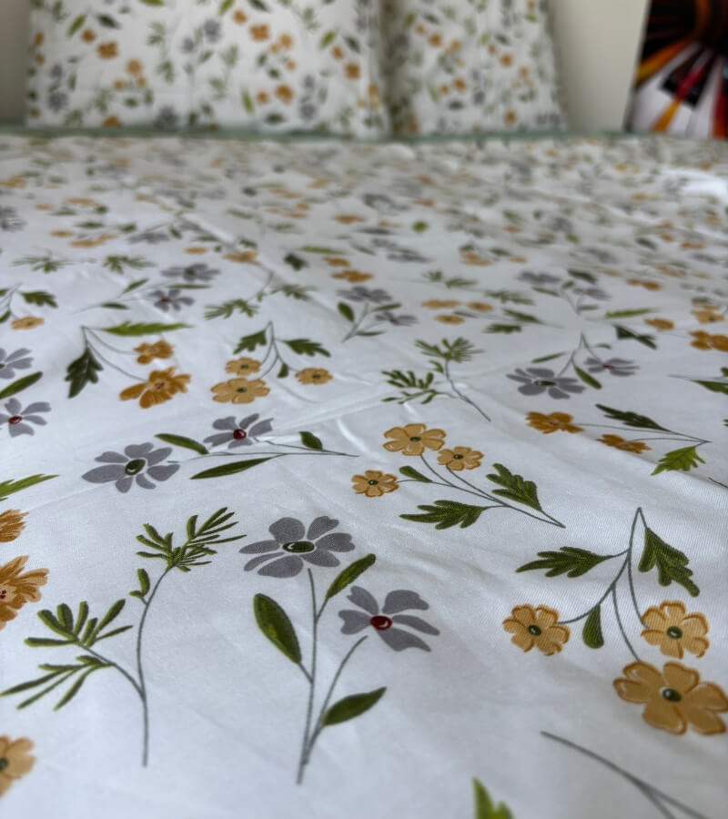 Szukasz pościeli, która rozświetli sypialnię bez krzykliwych kolorów? „Słoneczna Łąka” to delikatny, roślinny wzór w odcieniach żółci, szarości i zieleni na jasnym tle. Efekt? Czysto, świeżo i bardzo przytulnie – idealnie na codzienny, spokojny sen.