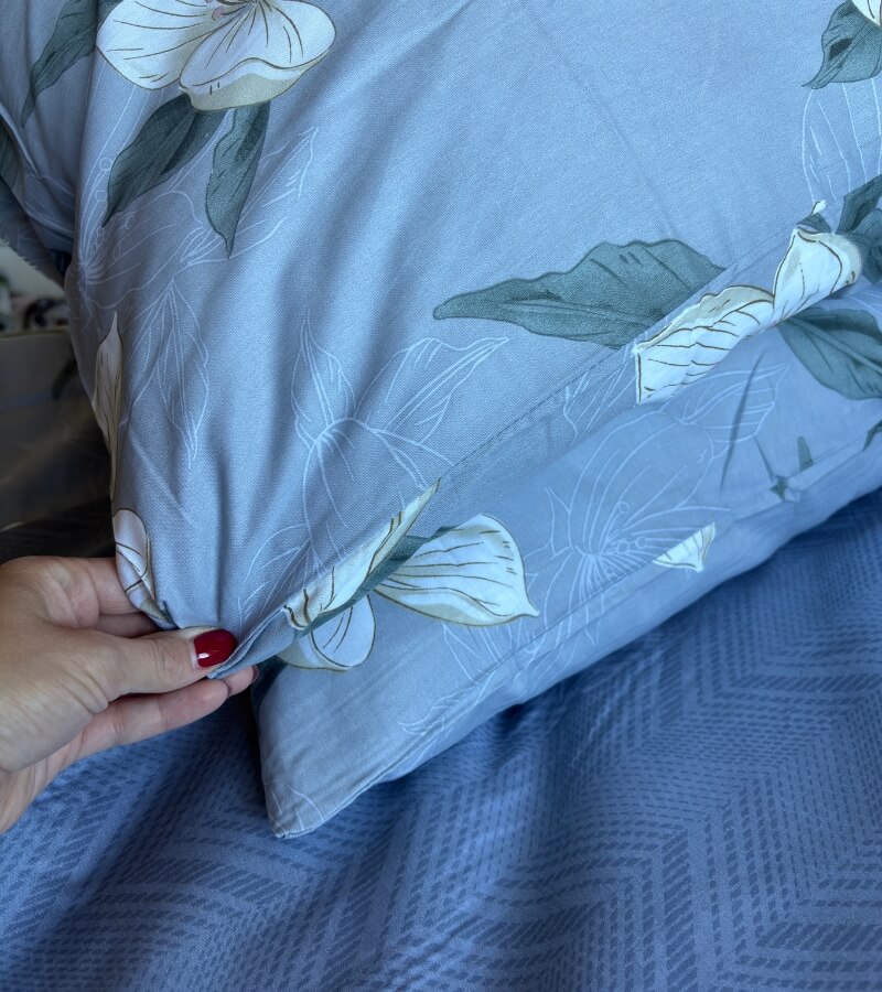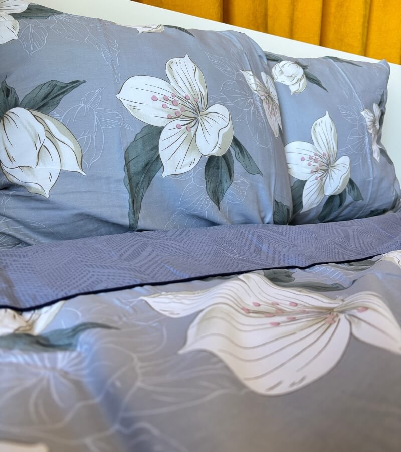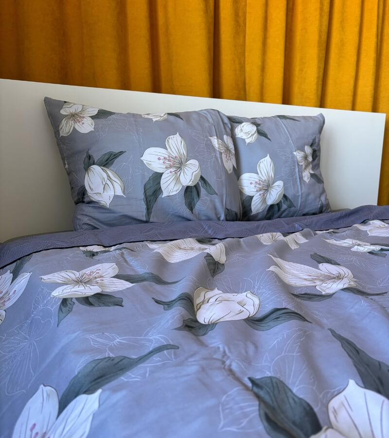 Pościel Magnolia 160×200 łączy elegancję dużego, botanicznego wzoru z praktycznością bawełny 100%. Kwiaty magnolii przywodzą na myśl ilustracje z albumów przyrodniczych – są miękkie w rysunku, ale wyraziste w formie, dzięki czemu łóżko staje się centralnym punktem sypialni. Chłodne, szaro-niebieskie tło nadaje całości nutę nowoczesności i świetnie komponuje się z bielą, drewnem oraz złotymi dodatkami.