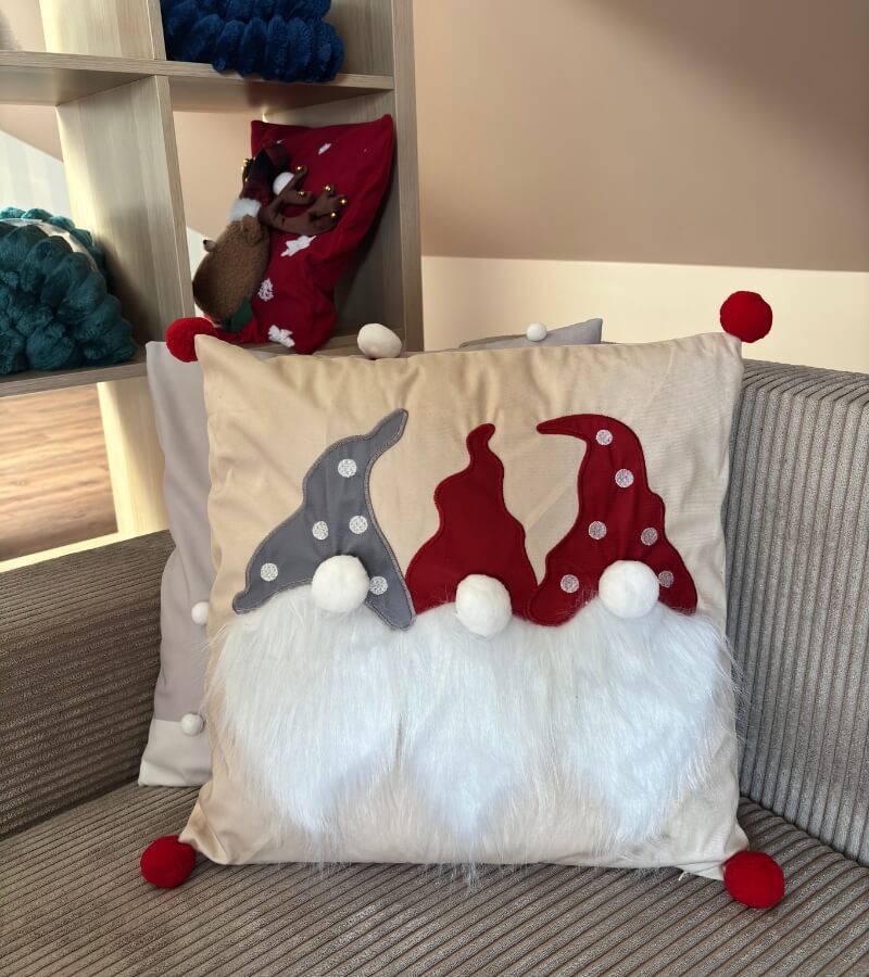 Jeśli szukasz poszewki świątecznej, która połączy uroczy motyw skrzatów, miękkość materiału i stonowaną, kremową kolorystykę, ta poduszka ze skrzatami będzie dla Ciebie świetnym wyborem.