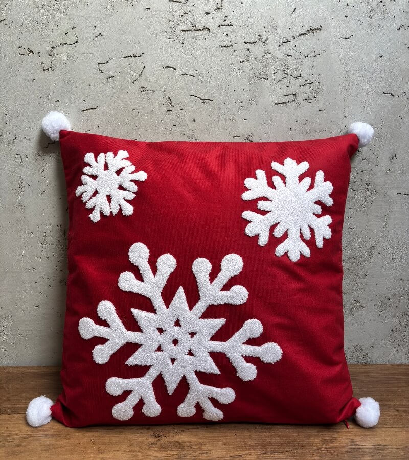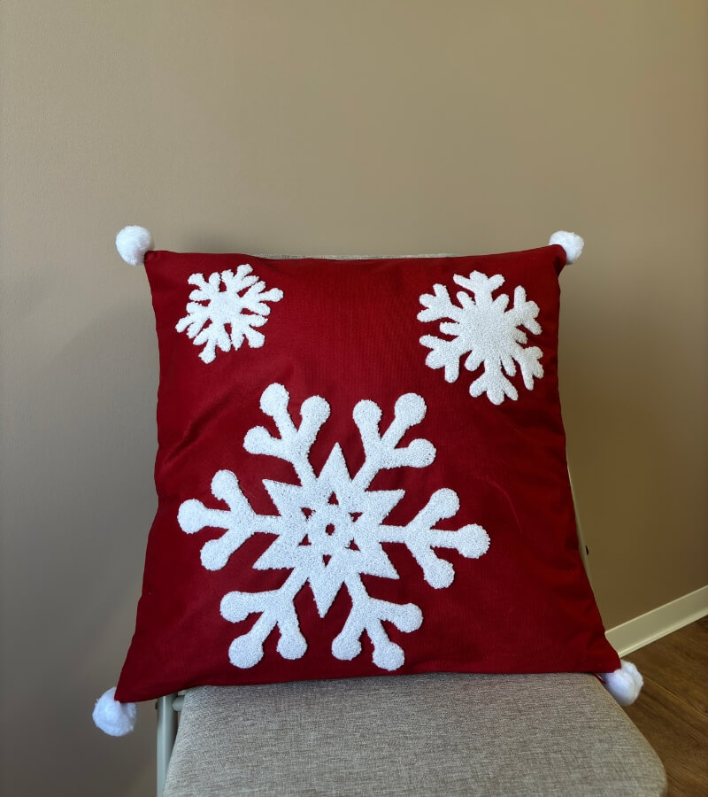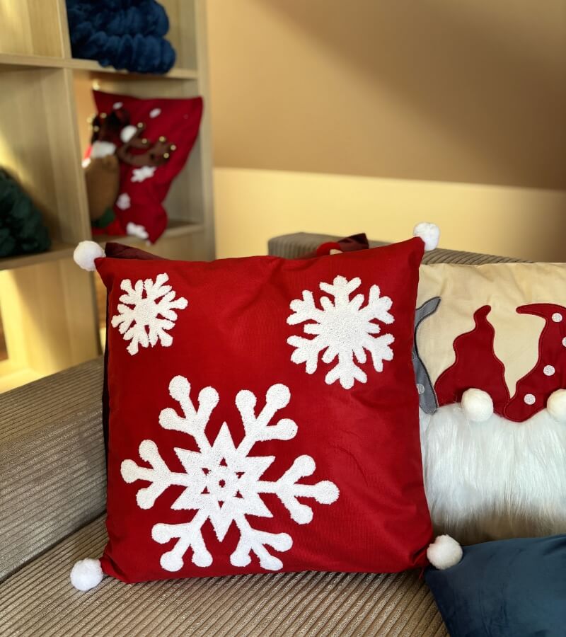 Poszewka ma uniwersalny rozmiar 45×45 cm, pasujący do większości standardowych wkładów. Czerwone tło pięknie podbija kolorystykę świątecznych dekoracji, a aplikowane śnieżynki i miękkie pompony w rogach dodają całości lekkości i uroku. Dzięki praktycznemu zamkowi błyskawicznemu z dołu poszewki z łatwością założysz ją na poduszkę i zdejmiesz po świętach. Materiał z 100% poliestru jest trwały i prosty w pielęgnacji, więc poszewka może wracać na sofę co roku, wciąż prezentując się świetnie.