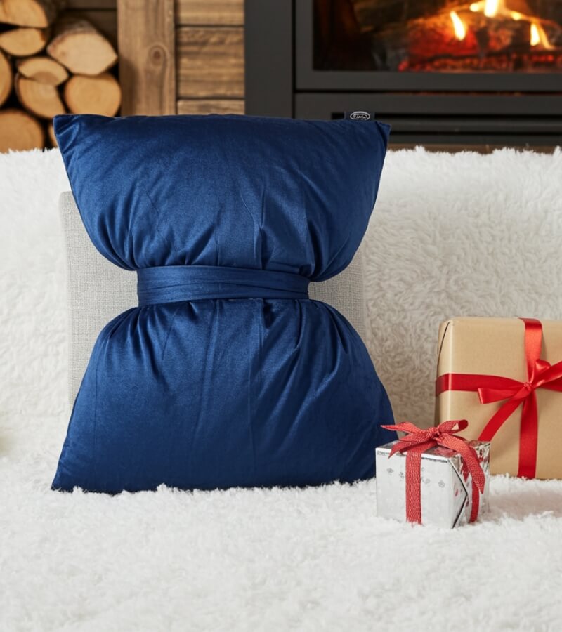 Szukasz dekoracji, która jednym ruchem odmieni salon lub sypialnię, bez wymiany całej aranżacji? Poduszka kokarda w kolorze granatu doda wnętrzu elegancji, a przy tym wprowadzi odrobinę świątecznego nastroju. Miękki, błyszczący welwet pięknie odbija światło, dzięki czemu poduszka wygląda jak mały prezent położony na kanapie czy fotelu.
