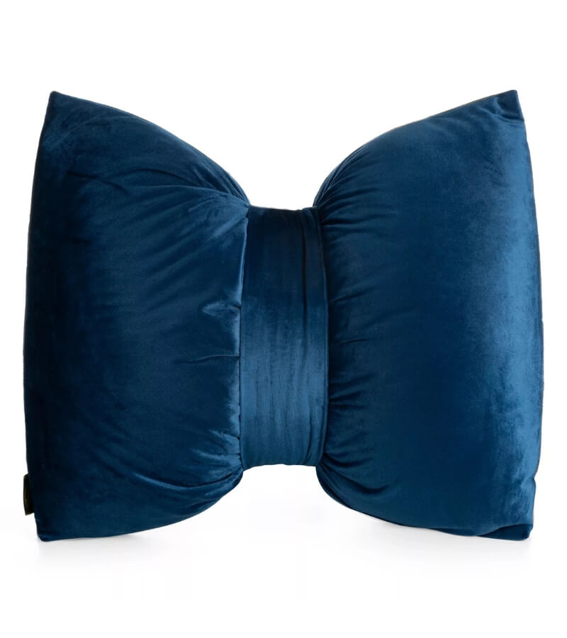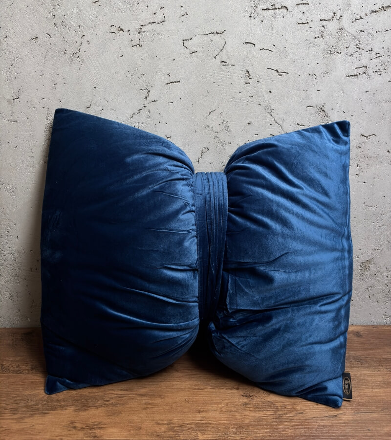 Na tle innych dekoracyjnych poduszek, ta wyróżnia się właśnie kształtem kokardy oraz głębokim, granatowym kolorem, który pasuje zarówno do świątecznych aranżacji (złoto, czerwień, biel), jak i do codziennej, eleganckiej stylistyki. Welwetowa tkanina nadaje jej szlachetny wygląd, a dopracowane marszczenia w centralnej części sprawiają, że kokarda prezentuje się efektownie z każdej strony.