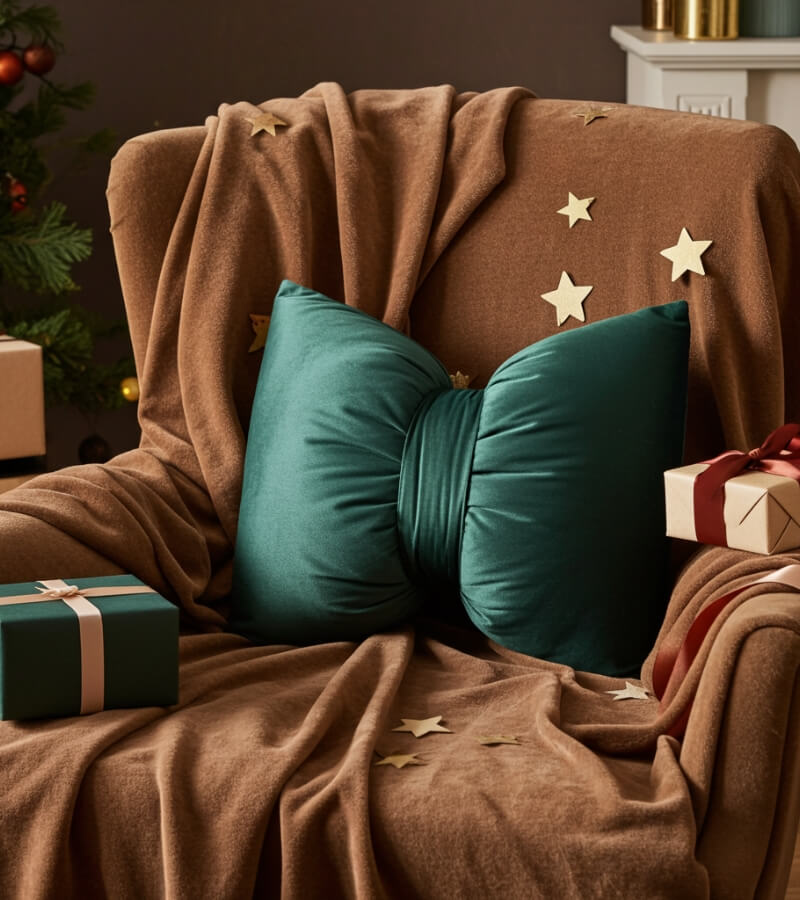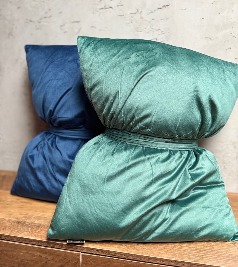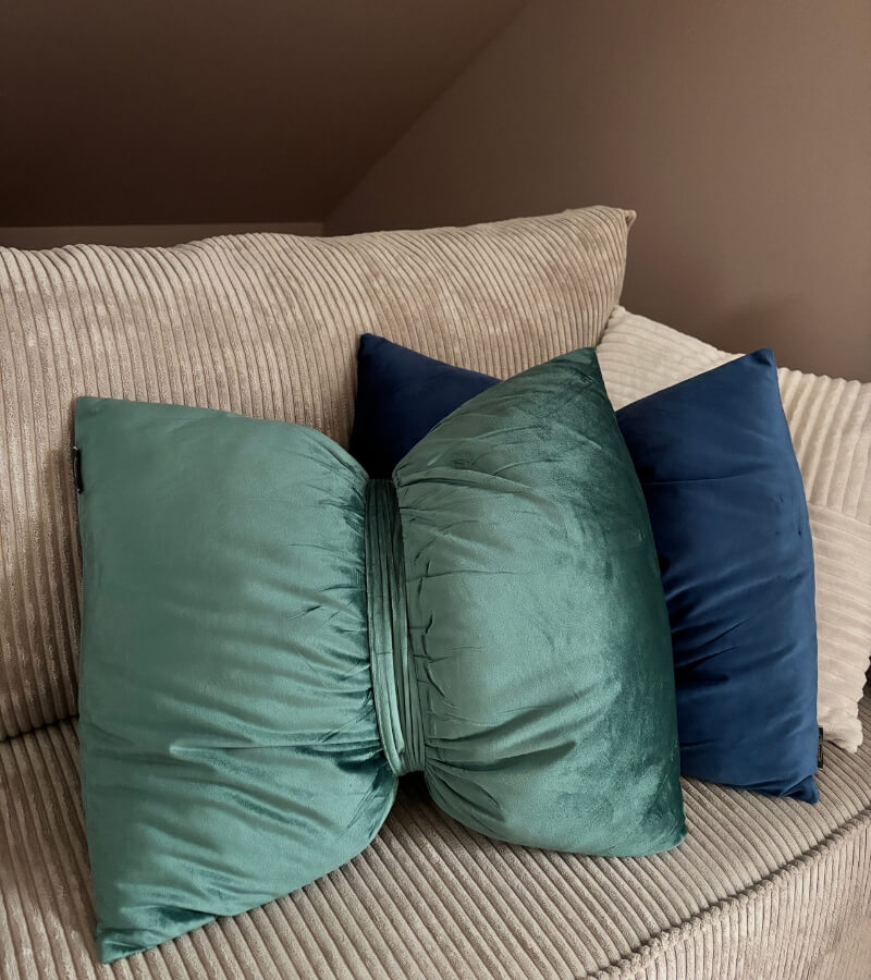 • Miękka poduszka kokarda z welwetu – efekt „wow” w salonie i sypialni